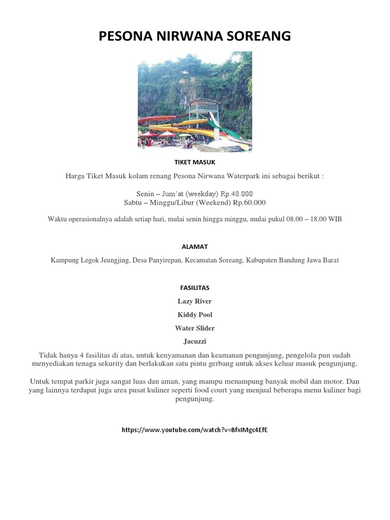 Seiring dengan jalannya waktu tanpa pemberitahuan terlebih dahulu. Disini terdapat banyak wahana air yang seru untuk dicoba. Wisata kolam renang bandung ini memiliki luas sekitar 4000 meter persegi dengan wahana dan fasilitas yang lengkap. Apalagi lokasi kolam renang manyar tirtoyoso ini yang cukup sepi karena berada di area perumahan. Harga tiket masuk yang ditarifkan kolam renang tirta mulya masih terbilang terjangkau yaitu rp.